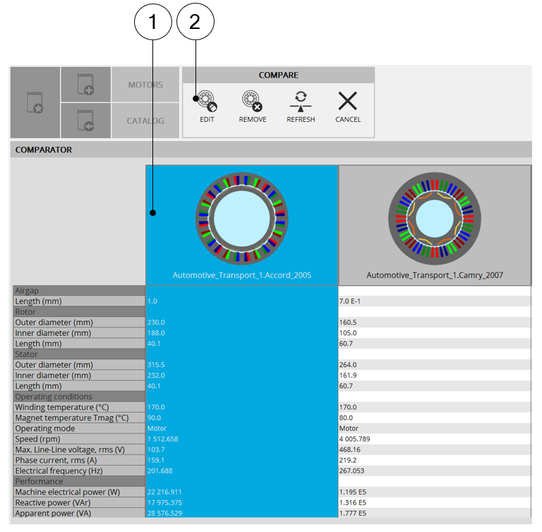 1 | From the comparator area Add the motors to be compared and select the motor. |