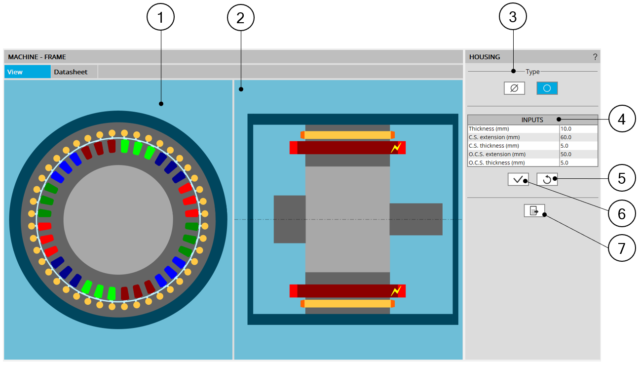 | 1 | Radial view of the motor, including the housing topology and dimensions. |