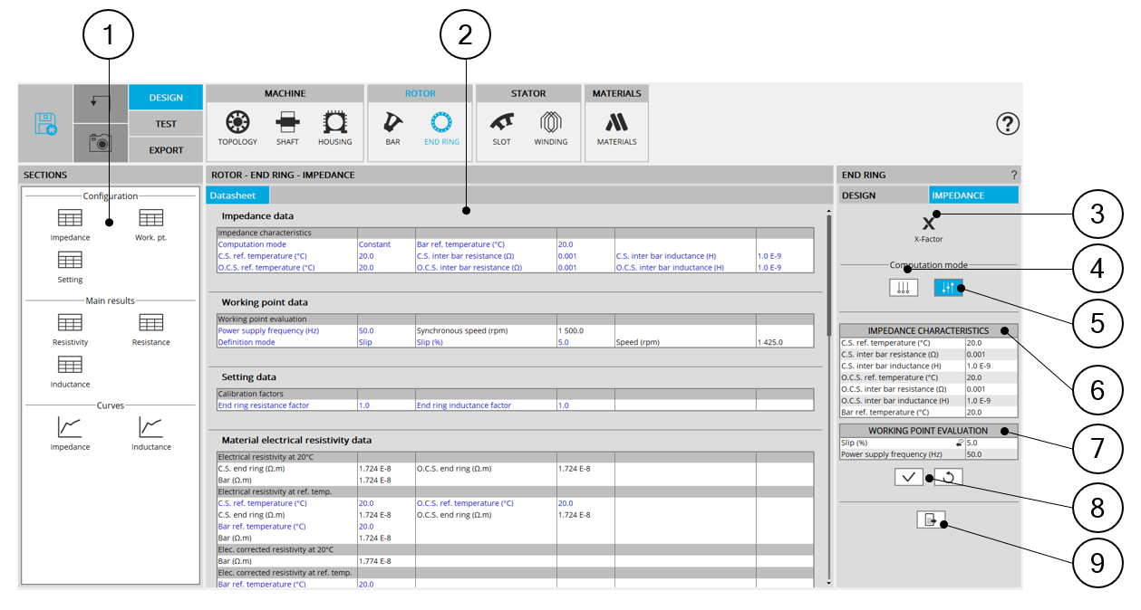 9 Icon to export end ring impedance data into *.txt or *.xls files.