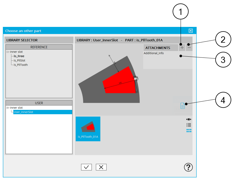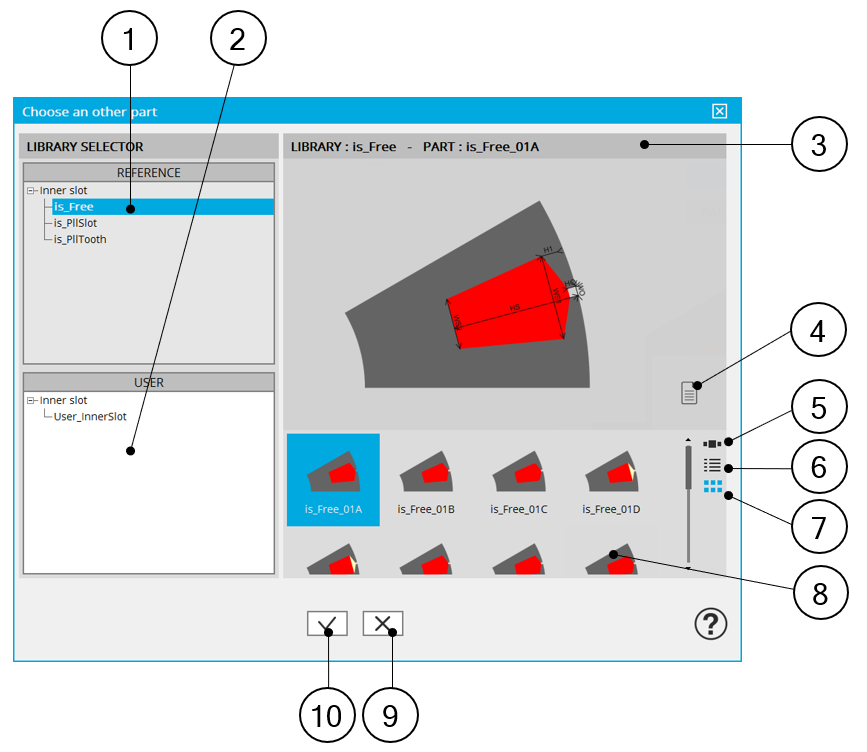 Select them to view their content and choose the slot among them. See “Part Library” application for more information.