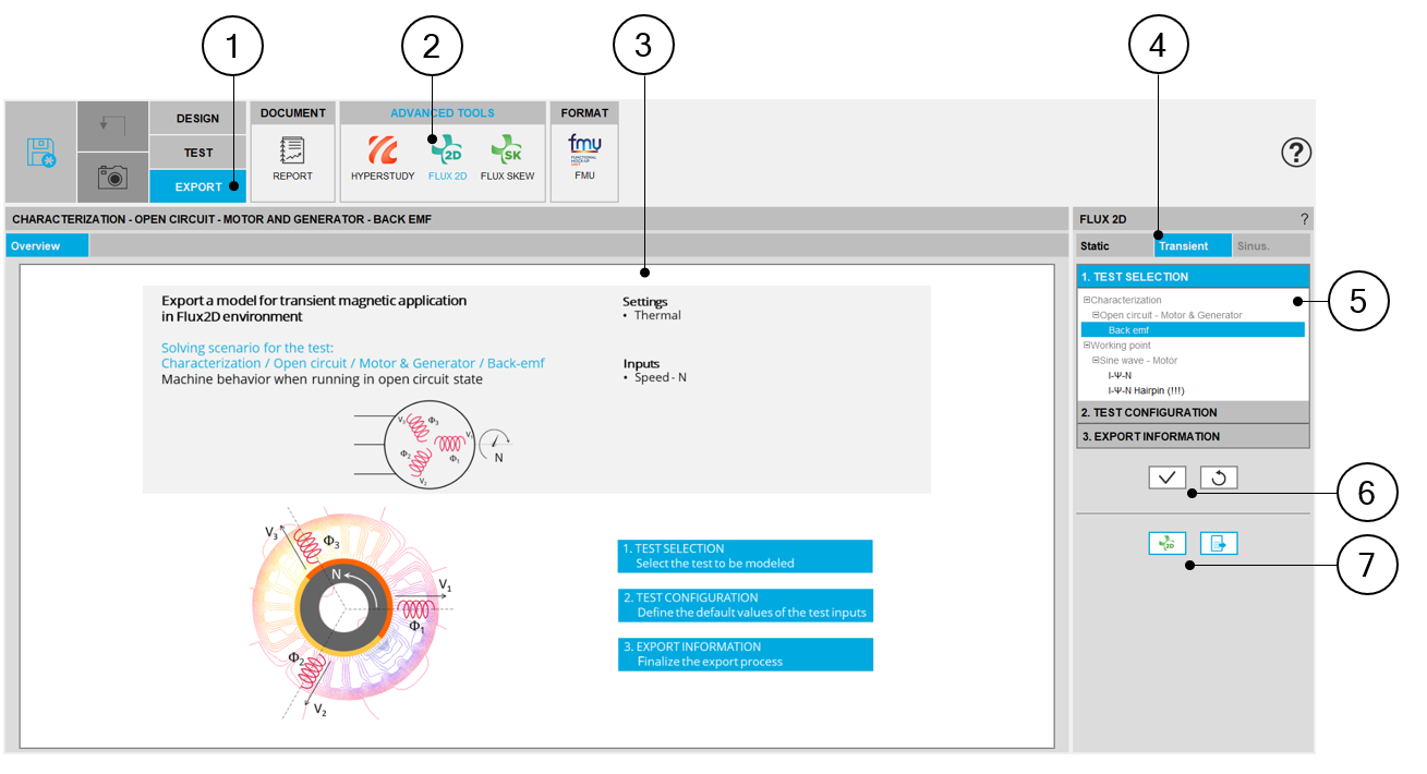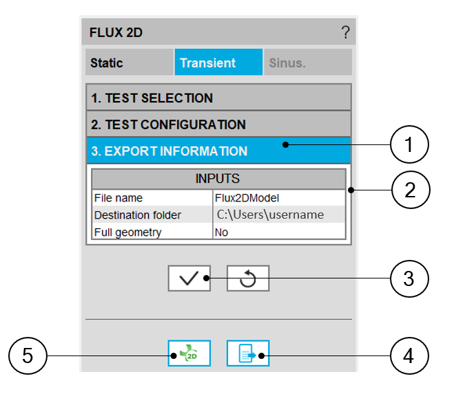 | 6 | Buttons to validate inputs and export the python file for building the model in Flux® 2D environment. |