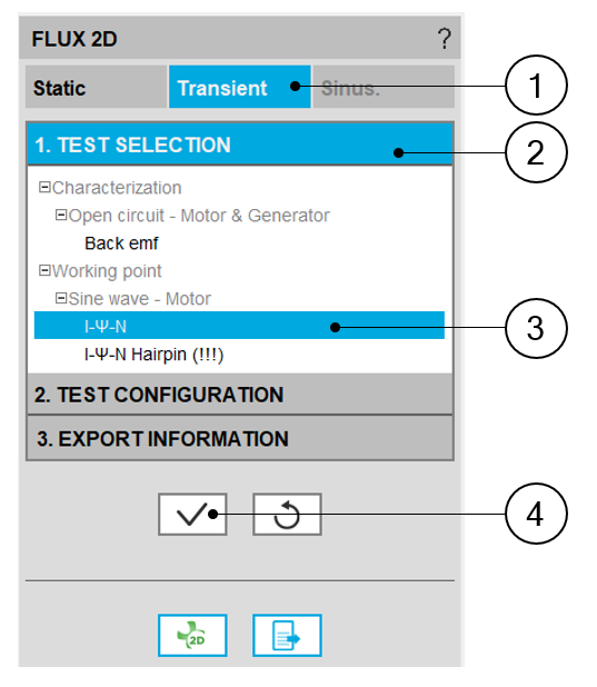 | 1 | Selection of application (STATIC or TRANSIENT) in which the model must be built for Flux® 2D |