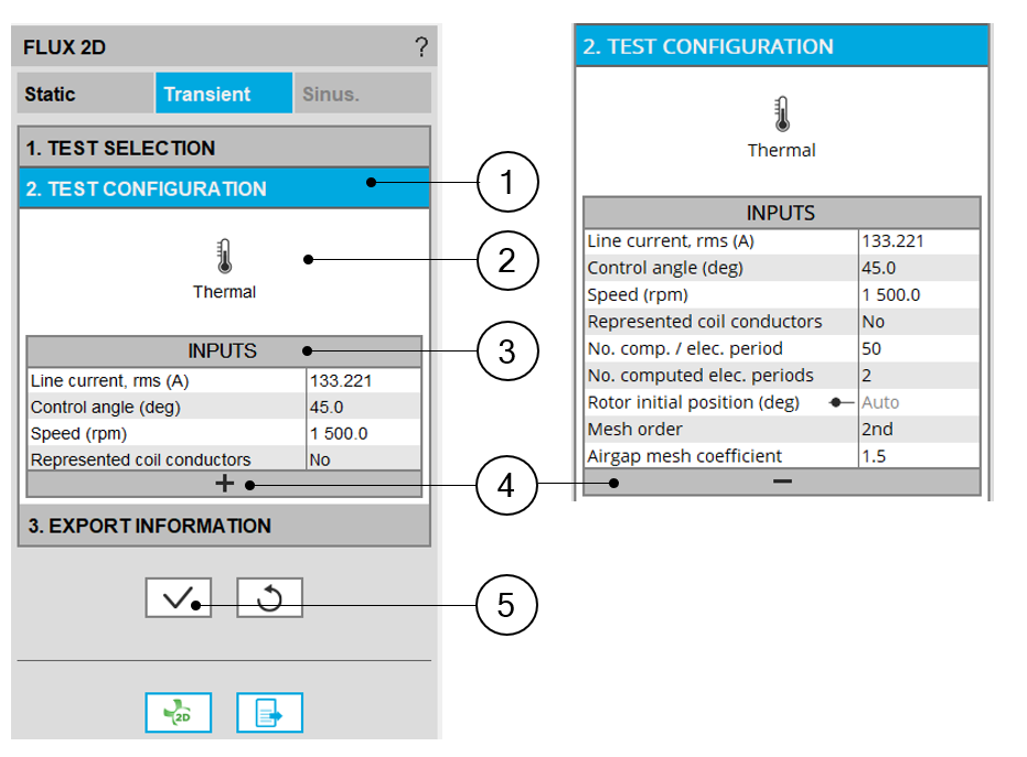 After selecting an application type (STATIC or TRANSIENT), the corresponding scenario (or test) inputs (settings and user inputs) must be defined. This allows to define the initial conditions for the simulation process in Flux® 2D environment.