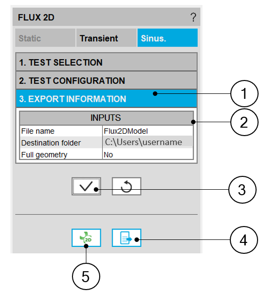 | 6 | Buttons to validate inputs and export the python file for building the model in Flux® 2D environment. |