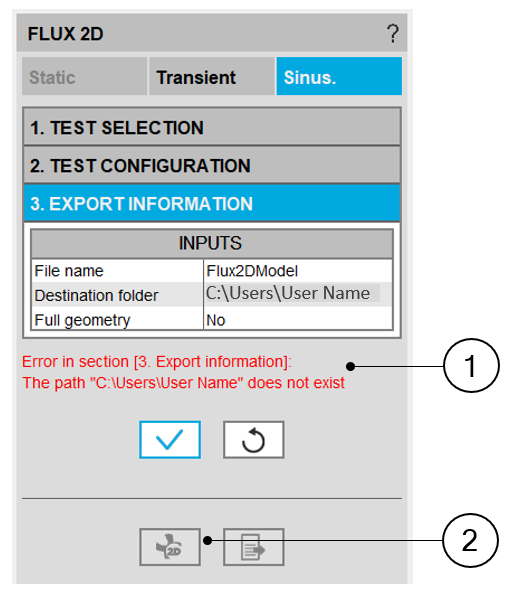 Motor Factory – EXPORT AREA – Export model for Flux® 2D – Error message 1 Error message written in red font 2 The button to export the model is not active if some needed data is missing -