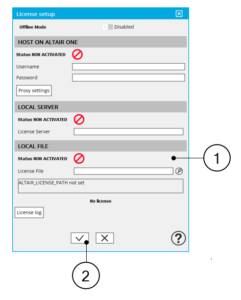 Figure 4. License via Altair One - Dialog box - Enter the Username and Password you created for your Altair One account (Mark 1 - Figure 4 – License via Altair One - Dialog box).