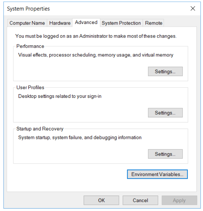 System Properties.Tip: In Windows 10, type env and then select Edit the System Environment Variables.