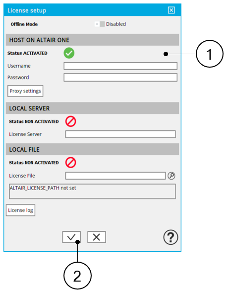 - Click on the apply button (Mark 2 - Figure 4 – License via Altair One - Dialog box). The status changes to ACTIVATED when the license is validated, or you will receive an error message if unsuccessful.