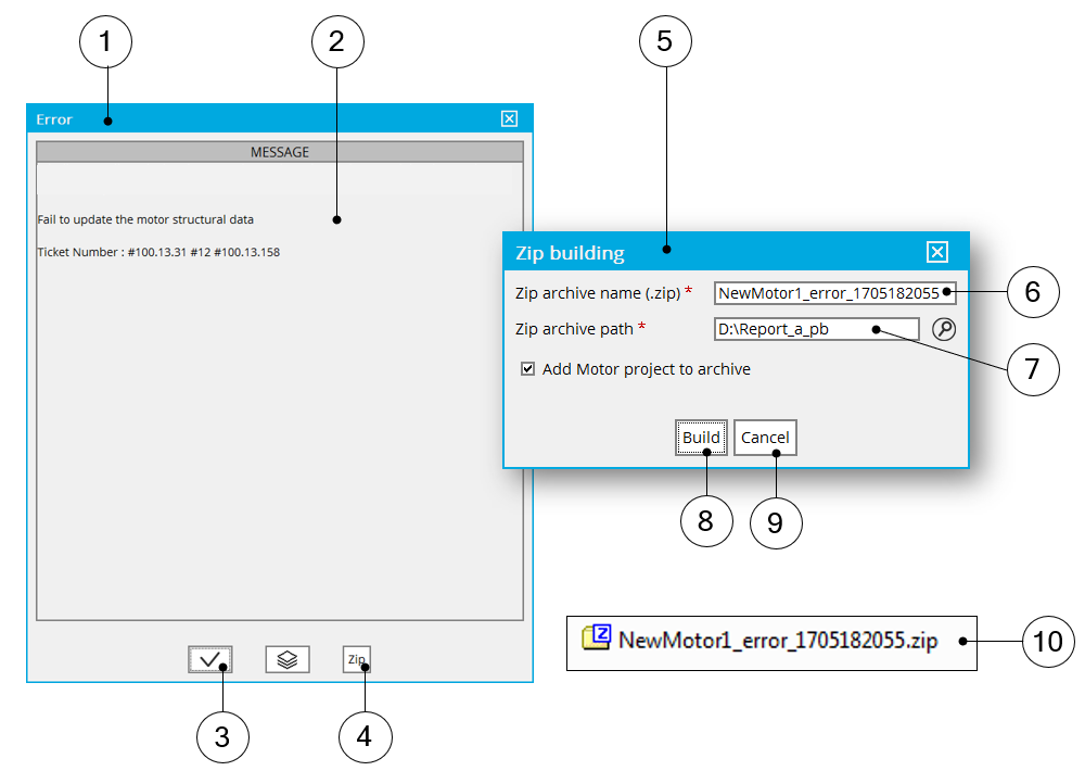 It allows creating a zip file which stores all the information needed for FluxMotor® support team to understand and solve (as far as possible) the problem.