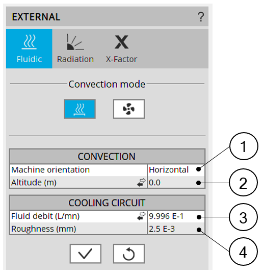 the user). This input exists only when a cooling circuit has been defined by the user in the MACHINE subset, HOUSING panel, CIRCUIT setting. It corresponds to the fluid flow debit or velocity existing in the cooling circuit. This input will be considered for every thermal computation, including the tests (and not only for the model evaluation in the external cooling design environment). |