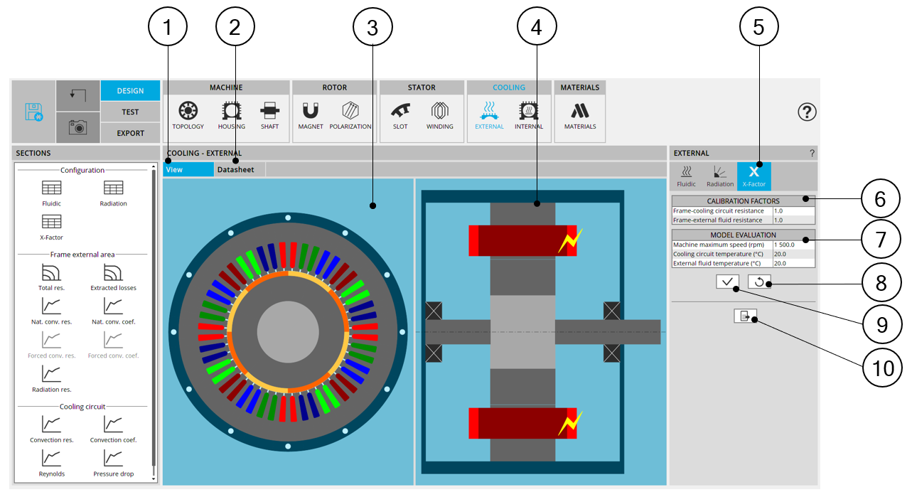 The X-Factor panel also contains a set of parameters driving the external cooling (coolant temperatures and rotor speed) allowing the user to evaluate the thermal model embedded.