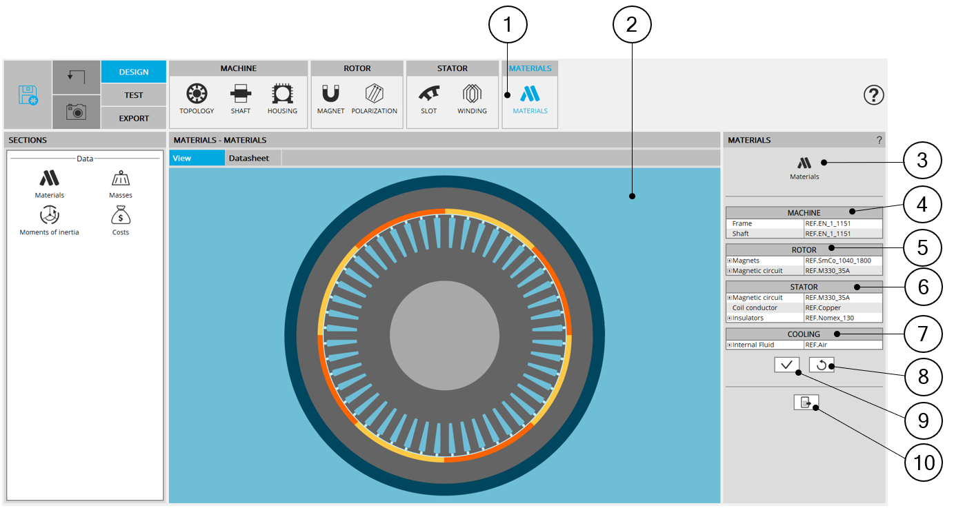 | 1 | Selection of the Material subset: MATERIALS panel (Click on the icon MATERIALS) |