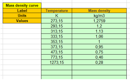 Here is the process to define the gas thermal characteristics from the importation of series of points representing the considered quantity curve listed in an Excel file. In the following example air mass density is considered, however the same principle is applied for all other gas thermal quantity which are defined below.