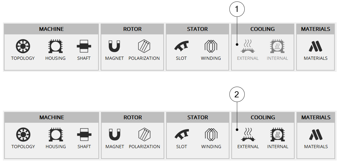 Internal cooling is unlocked when on the one hand a frame is defined (Machine / Housing / Frame environment) and on the other hand a shaft with bearings are defined (Machine / Shaft / Bearing environment). See below illustrations.