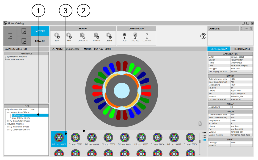 All the motors resulting from the runs performed with HyperStudy can be used back in Motor Catalog of FluxMotor® and then they can be edited in Motor Factory very quickly.
