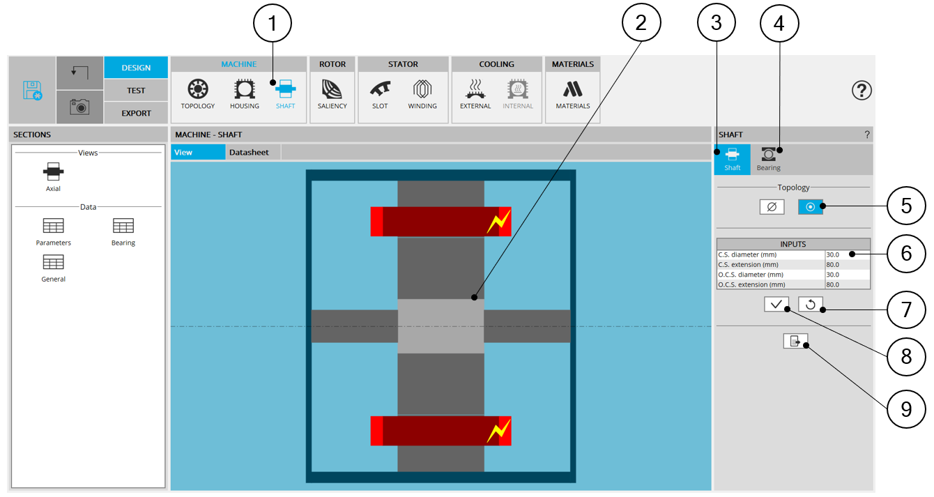 | 1 | Selection of the MACHINE subset: SHAFT panel (Click on the icon SHAFT) |