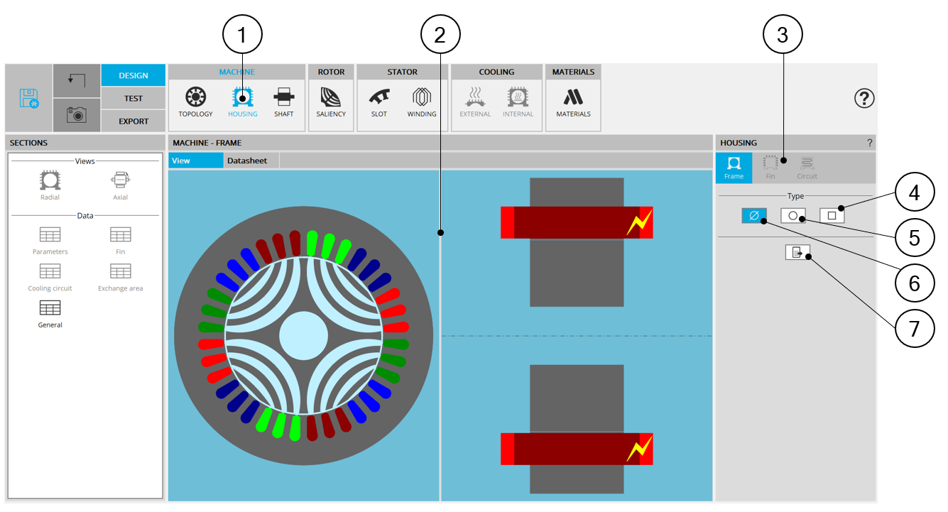 3 Several sections allow defining all characteristics which are dealing with the Housing: Frame, Fin and Cooling circuit.