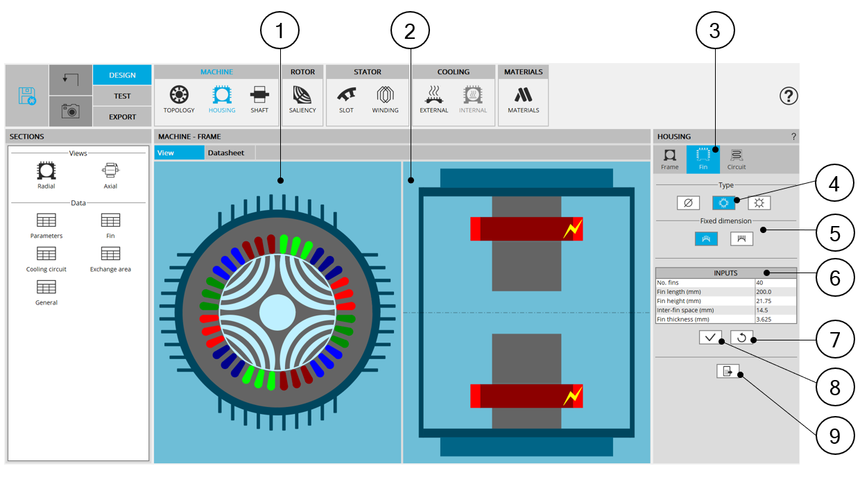 | 1 | Radial view of the motor, including the housing topology with fin topology and dimensions. |