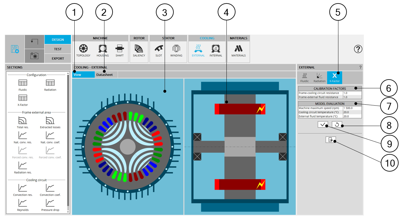 The X-Factor panel also contains a set of parameters driving the external cooling (coolant temperatures and rotor speed) allowing the user to evaluate the thermal model embedded.