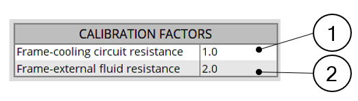 | 1 | Frame-cooling circuit resistance. This calibration factor is applied on the thermal resistance linking the frame and its cooling circuit. This X-factor exists only when a cooling circuit is defined by the user in the MACHINE subset, HOUSING panel, CIRCUIT setting. |