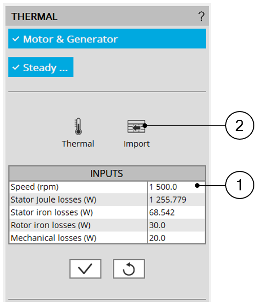 Note: The imported data are the output data directly shown in the considered solved test. For some tests, some values are not defined (like for instance the rotor iron losses). In that case, the corresponding values are set to 0 in the thermal characterization input table.