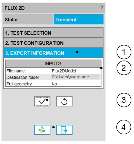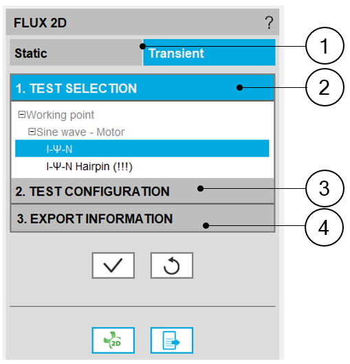 Motor Factory – EXPORT AREA – Export model for Flux® 2D environment 1 Select application (STATIC or TRANSIENT) in which the model must be built in Flux® 2D 2 Choose one scenario (or test) to be provided 3 Define the initial conditions for the simulation process in Flux® 2D environment 4 Define export information
