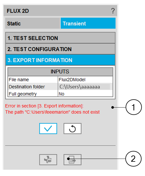 | 6 | Buttons to validate inputs and export the python file for building the model in Flux® 2D environment. |