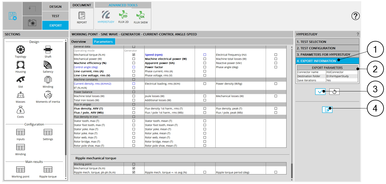 In EXPORT / ADVANCED TOOLS / HYPERSTUDY area 4 steps are needed to build and export a report: