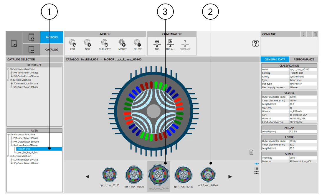 All the motors resulting from the runs performed with Altair® HyperStudy® can be used back in Motor Catalog of Altair® FluxMotor® and then they can be edited in Motor Factory very quickly.