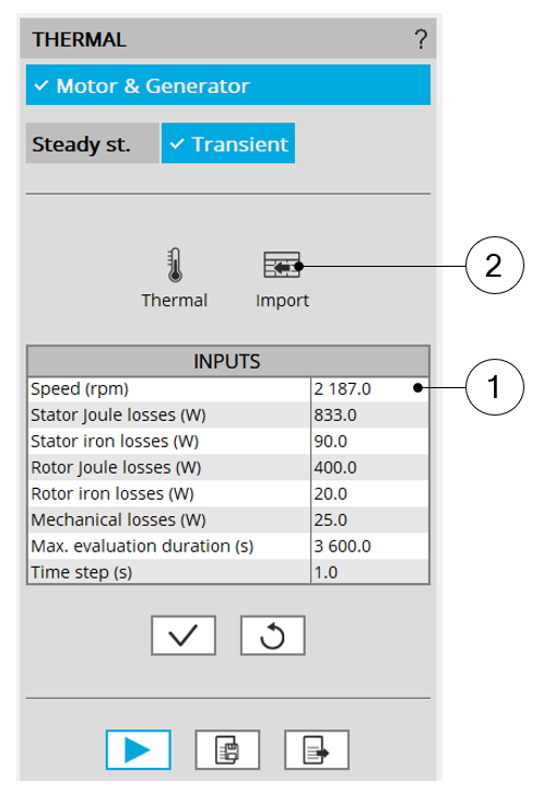 | 1 | Fill in the table to define the speed, all the losses to be considered, the max evaluation duration and the time step. |