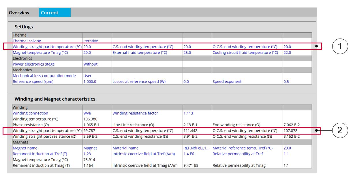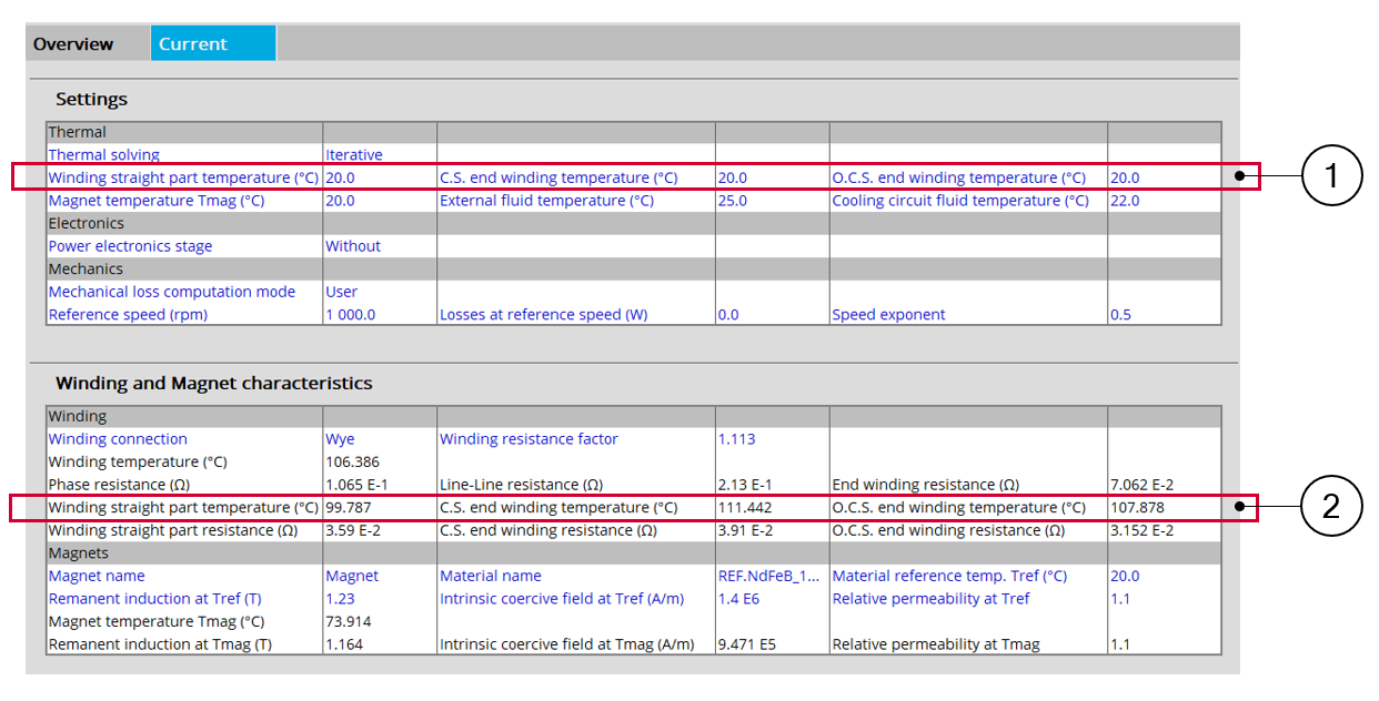 - The temperatures which are considered for computing the final machine performance (step 4 in the previous flow chart) can be read in the table dealing with “Winding and Magnet characteristics” of the test configuration at the beginning of result report. See below illustration.
