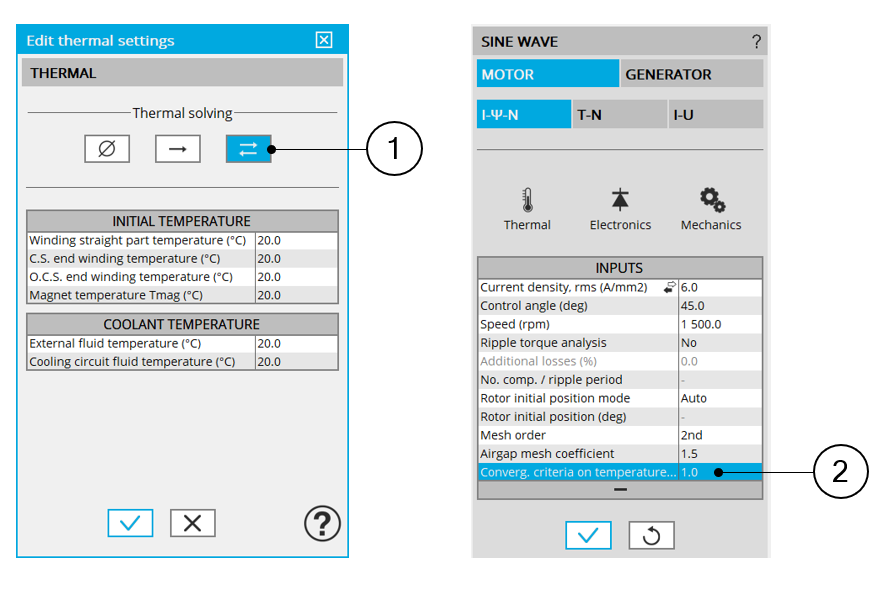 | 1 | Dialog box to define thermal setting. Iterative solving mode is selecting |