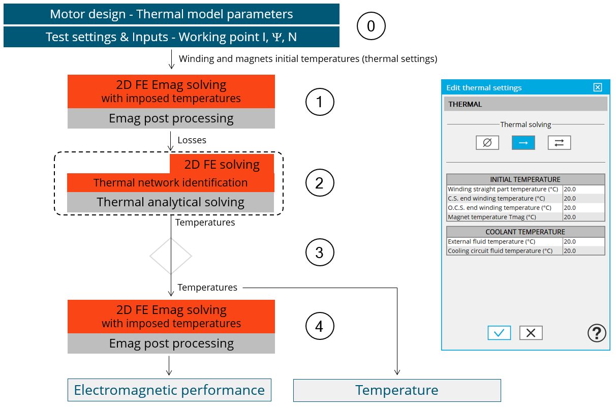| 3 | Iterative process = loop between electromagnetic and thermal computations until the convergence on the temperature is reached (See below where can be adjusted the convergency criteria when needed) |