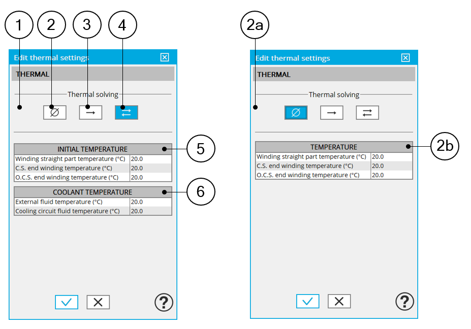 | 2a | Dialog box that allows to define the machine active components winding and magnets temperatures to run test without any thermal analysis. |