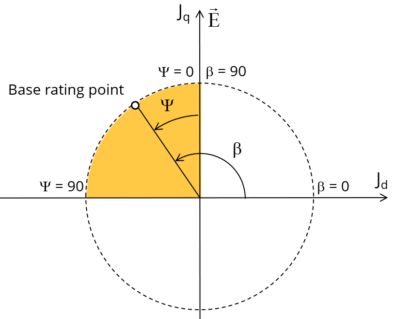 Considering the vector diagram shown below, the “ Control angle ” is the angle between the electromotive force E and the electrical phase current (J) (Ψ = (E, J)).