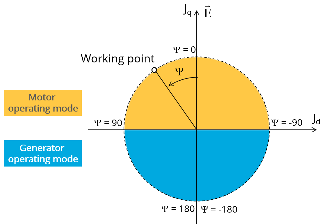 Considering the vector diagram shown below, the “ Control angle ” is the angle between the electromotive force E and the electrical current (J) (Ψ = (E, J)). It is an electrical angle. It must be set in a range of -90 to 90 degrees.