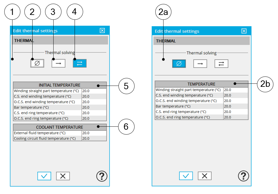 | 2a | Dialog box that allows to define the machine active components winding and magnets temperatures to run test without any thermal analysis. |