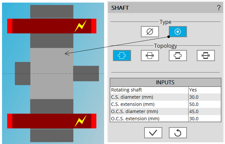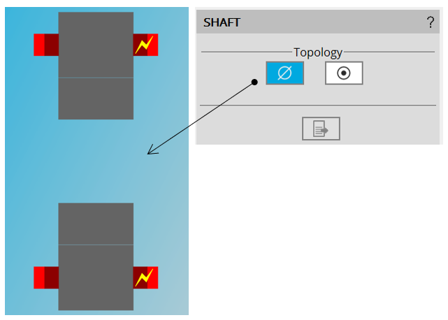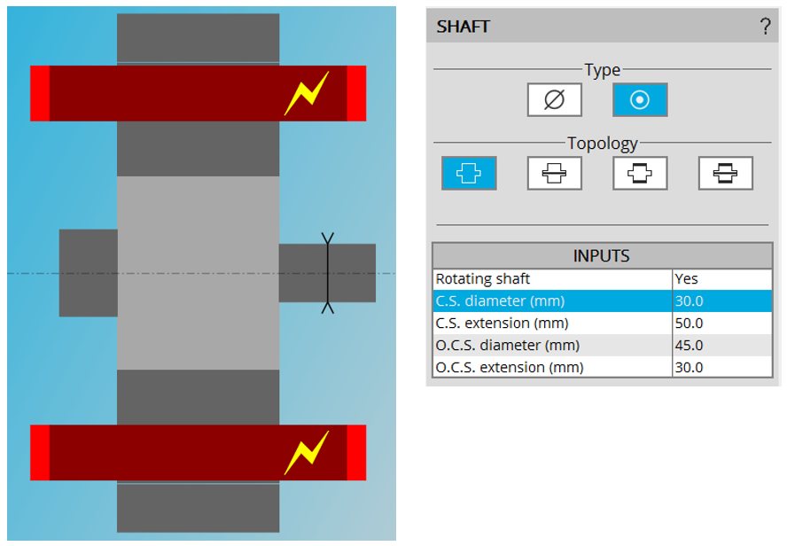 • Type = Solid: 4 different topologies of shaft can be considered in the rotor design. It is built with a solid material or laminations. The four topologies are described below.