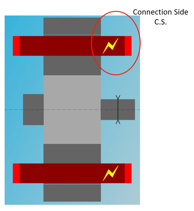 Dimensions are illustrated with arrows Connection side (C.S.) is identified by yellow lightning