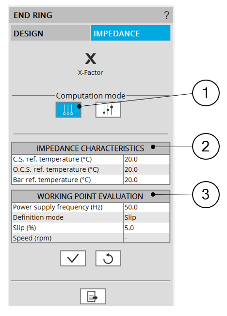 When automatic computation mode is set, inter bar end-ring impedances are computed by internal processes, being a function of the slip (or speed), the temperature at the end ring (at Connection Side and Opposite Connection Side), and the material of the end ring.
