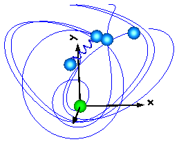 This model demonstrates the usage of model Parts.PointMass in a point gravity field. The PointMass model has the feature that the rotation is not taken into account and can therefore also not be calculated. This example demonstrates two cases where this does not matter: If a PointMass is not connected (body1, body2), the orientation object in these point masses is set to a unit rotation. If a PointMass is connected by a line force element, such as the used Forces.LineForceWithMass component, then the orientation object is set to a unit rotation within the line force element. These are the two cases where the rotation is automatically set to a default value, when the physical system does not provide the equations.