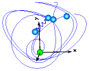 This model demonstrates the usage of model Parts.PointMass in a point gravity field. 6 point masses are connected rigidly together. Translating such a model results in an error, because point masses do not define an orientation object. The example demonstrates that in such a case (when the orientation object is not defined by an object that is connected to a point mass), a "MultiBody.Joints.FreeMotion" joint has to be used, to define the degrees of freedom of this structure.