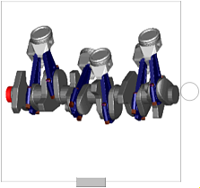 This is a model of the mechanical part of one cylinder of an engine. The combustion is not modelled. The "inertia" component at the lower left part is the output inertia of the engine driving the gearbox. The angular velocity of the output inertia has a start value of 10 rad/s in order to demonstrate the movement of the engine.