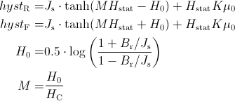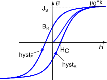 Flux tube element for modeling soft magnetic materials with ferromagnetic and dynamic hysteresis (eddy currents). The ferromagnetic hysteresis behavior is defined by the Tellinen hysteresis model. The shape of the limiting hysteresis loop (see Fig. 1) is described by simple hyperbolic tangent functions with 4 parameters. Therefore, the hysteresis shape variety is limited but the parameterization of the model is very simple and the model is relatively fast and robust. The rising (hystR) and falling (hystF) branches of the limiting hysteresis loop are defined by the following equations.