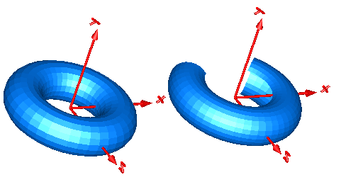 Model Torus visualizes a torus. The center of the torus is located at connector frame_a (visualized by the red coordinate system in the figure below). The left image below shows a torus with ri=0.5 m and ro = 0.2 m. The right images below shows the torus with the additional parameter settings: