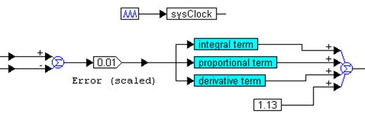 The computation of the derivative is implemented using a unitDelay block, two gain blocks, and two summingJunctions blocks, as shown above. The sysClock clock input to the unitDelay is defined using a pulseTrain block, and the contributions of the P, I, and D terms are summed up, as shown below.