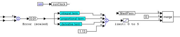 For ease of implementation, these blocks are encapsulated in a compound block called PID Control (CONTROLLER) and the inputs and outputs are labeled appropriately.