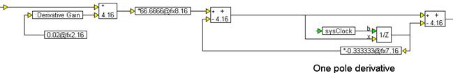 The arithmetic operations of the derivative term are replaced with fixed-point equivalents, const, mul, sum, and gain, as shown below.