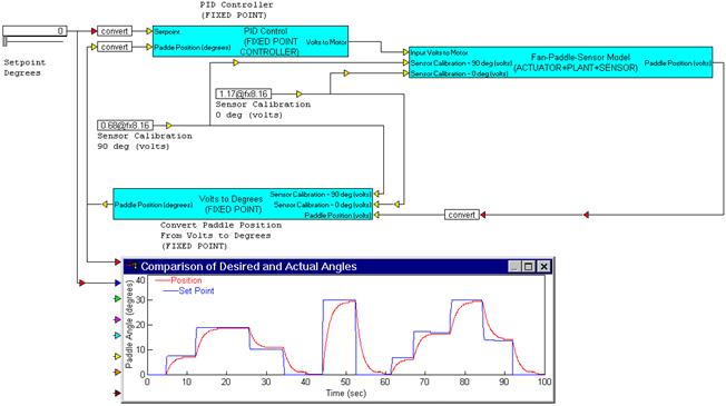 It is important to note that in the simulation depicted above, the PID Control and Volts to Degrees Converter are simulated by Embed in scaled fixed-point while the Fan-Paddle-Sensor is simulated in floating-point. This means that you can simulate how a given control or logic prototype would execute on a fixed-point embedded system target, such as a DSP or a microcontroller. This lets you answer in a single design and simulation iteration, crucial questions, such as: