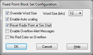 You can choose the radix point bits or select auto scaling. This option, together with the global settings in the Tools > Fixed Point Block Set Configure dialog, let you automatically monitor the maximum and minimum values seen by the block, and adjust the radix point bits to yield maximum precision while preventing numerical overflow.